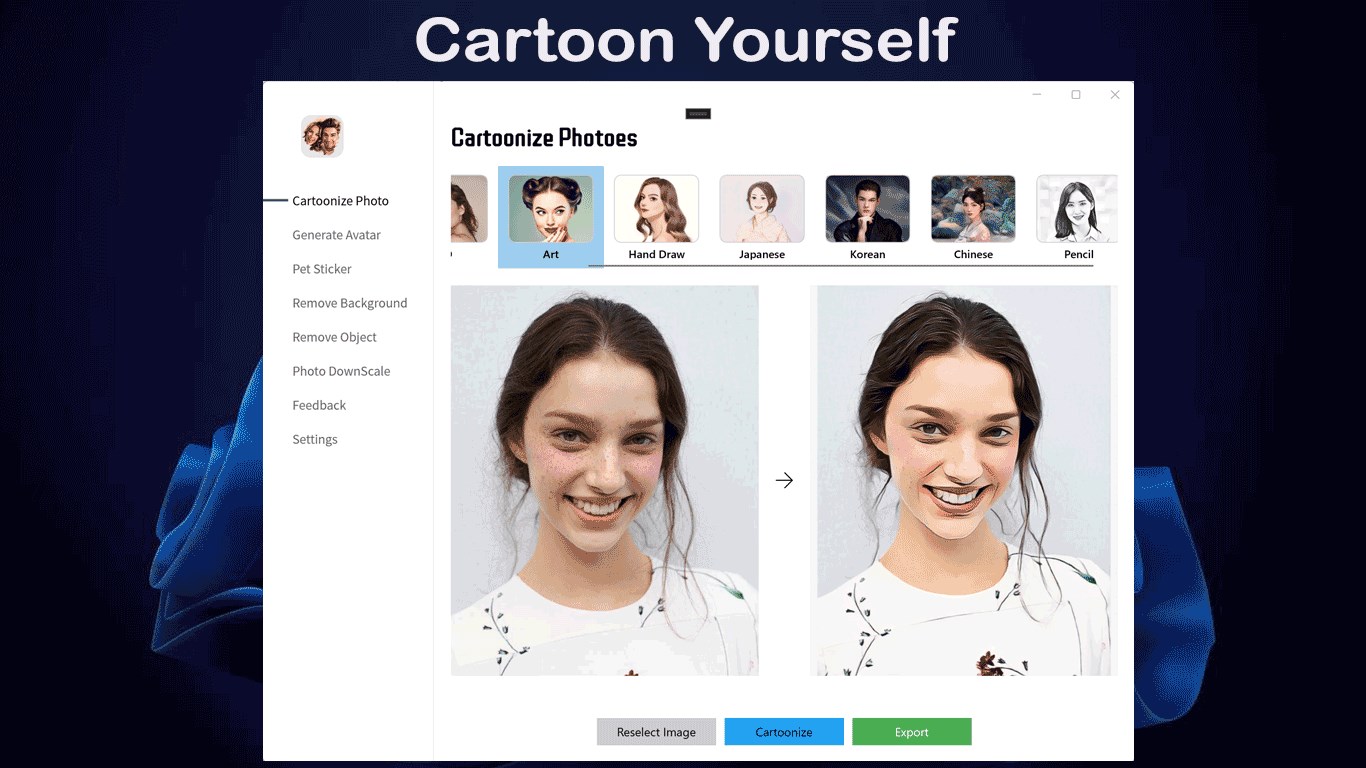 ToonApp这款工具可以将你的头像动漫卡通化,这个版本现已解锁全部功能可用。你可以用它在你梦想的任何场景中卡通化自己,用不同的背景将自己卡通化,生成三维可爱漫画、还可以全景动漫化、生成非常炫酷的背景卡通画、滑稽漫画等。